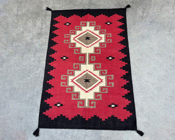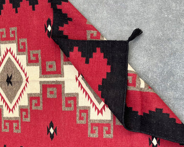 Transform your space with timeless Southwestern artistry. This 6×4 ft Handwoven Wool Rug showcases a dramatic design inspired by traditional Southwestern motifs. The bold red, deep black, soft cream, and earthy taupe tones come together to create a visually stunning piece that instantly draws attention and anchors any room.