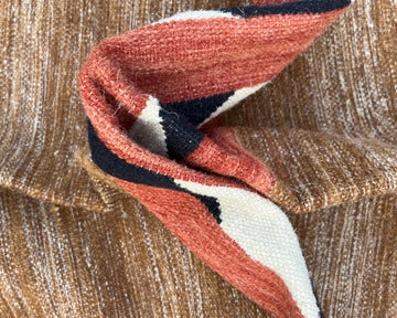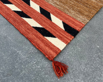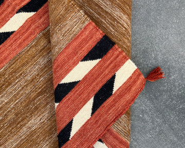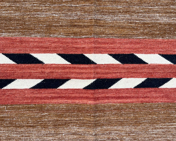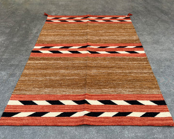 Add rustic elegance to your interiors with this timeless handcrafted rug. Our 6×4 ft Handwoven Wool Rug blends rich earthy browns, warm terracotta, bold black, and natural cream into a striped Southwestern-inspired design accented with striking geometric bands. Its classic palette and simple yet bold pattern make it a versatile piece for modern, rustic, or bohemian spaces.